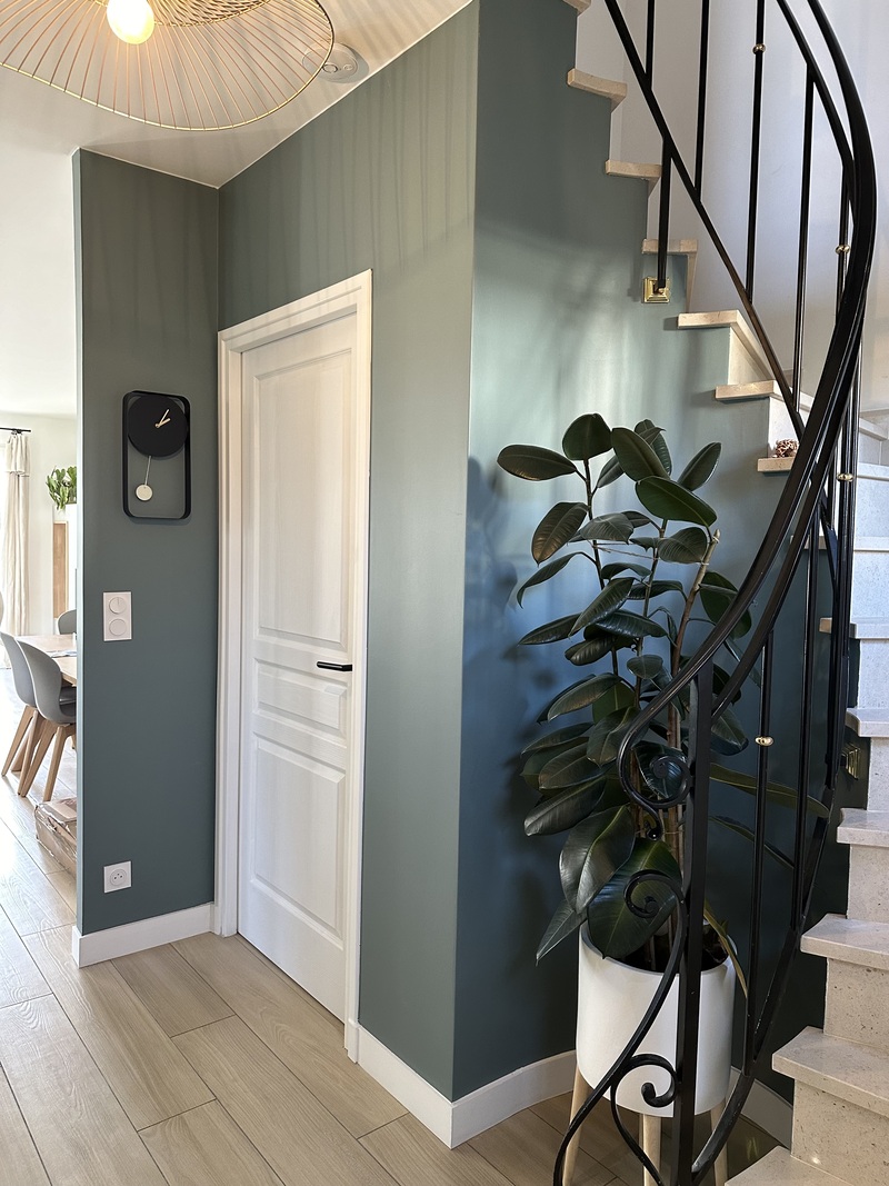 L’entrée a, elle aussi, été redéfinie comme un véritable sas identitaire. Des teintes vert-gris enveloppantes viennent structurer l’espace et se prolongent jusqu’au sous-sol, créant un fil conducteur esthétique cohérent. La création d’une nouvelle cloison autour de la cage d’escalier permet désormais d’isoler acoustiquement le niveau inférieur dédié au sport, aux jeux et à la musique, garantissant le calme et la sérénité du séjour au quotidien.