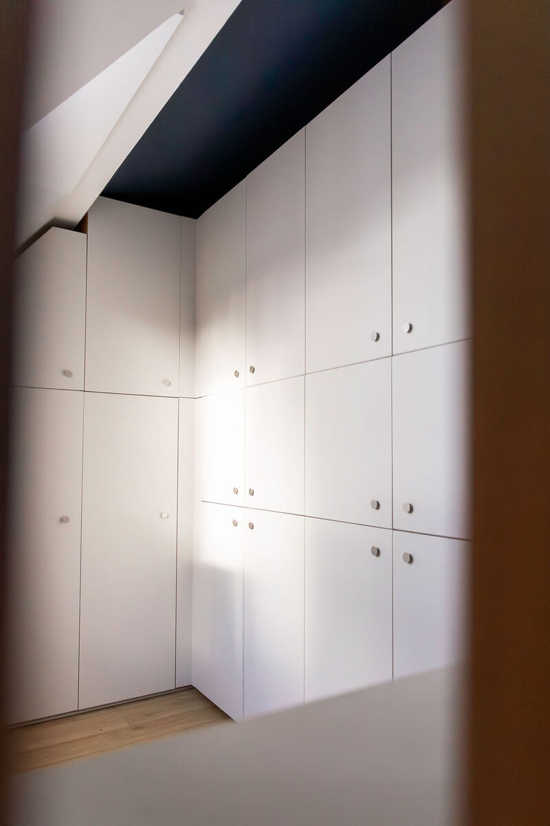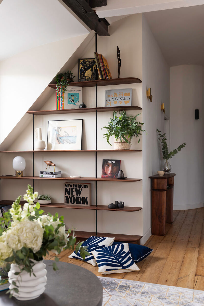 Ce loft de près de 200m² niché sous les toits de Paris a été entièrement réinventé grâce à de nombreux aménagements sur-mesure, conçus pour optimiser chaque recoin tout en préservant une esthétique élégante et cohérente.