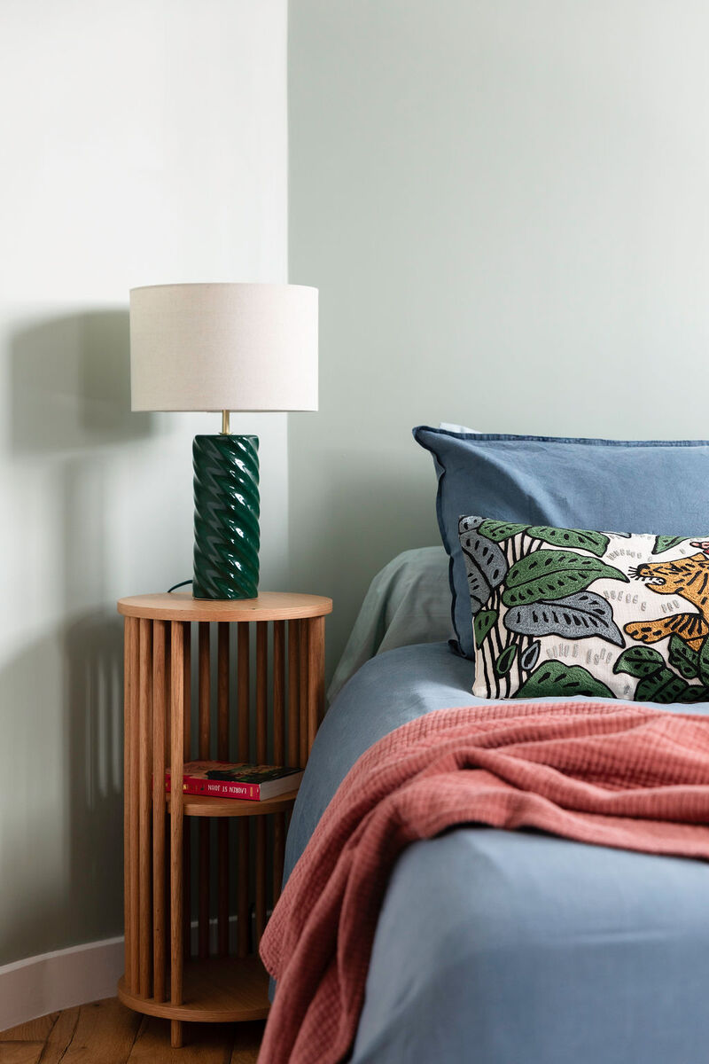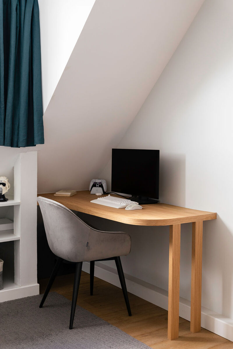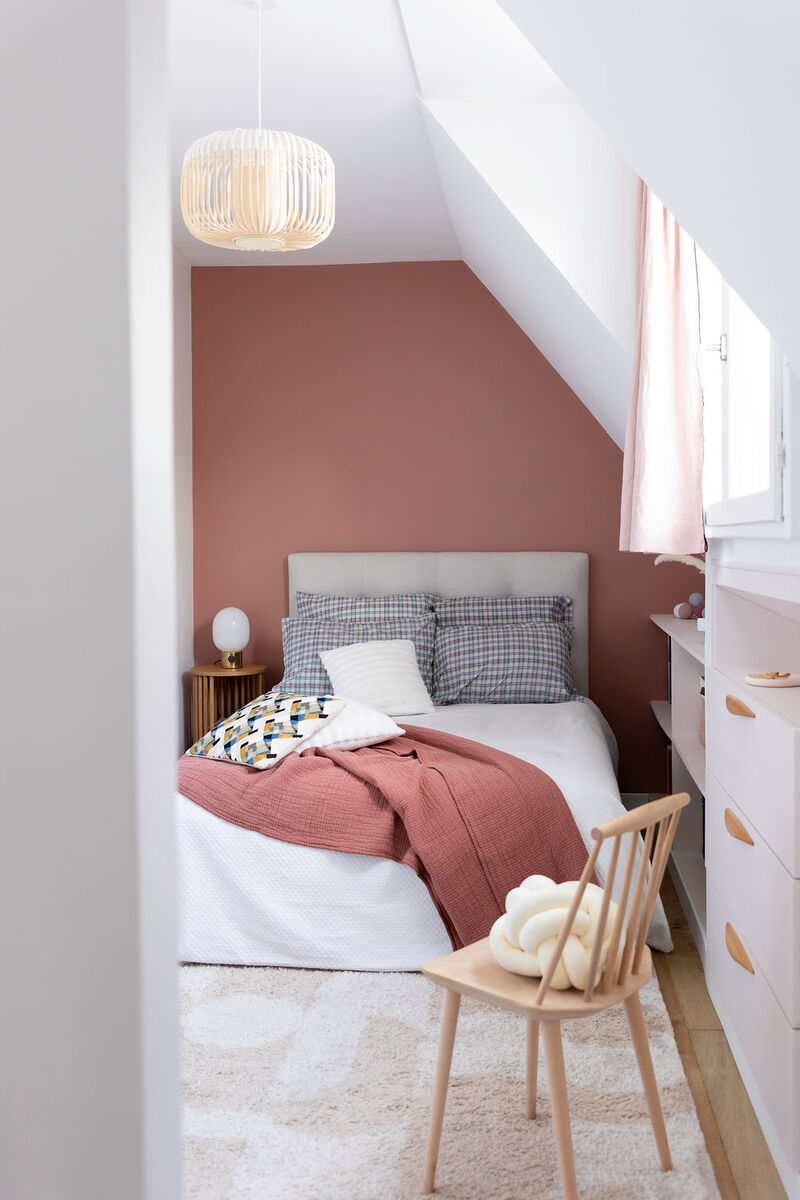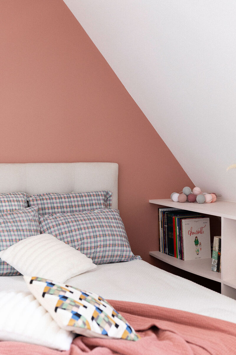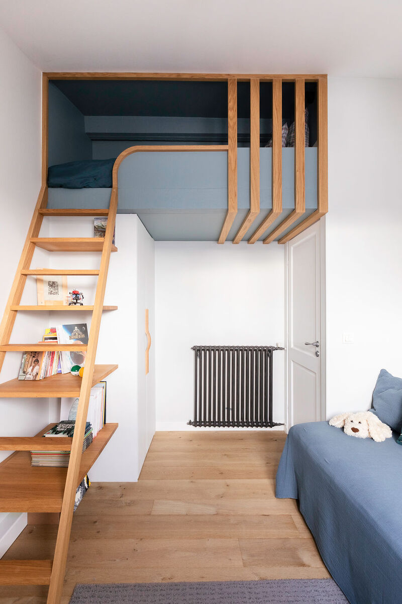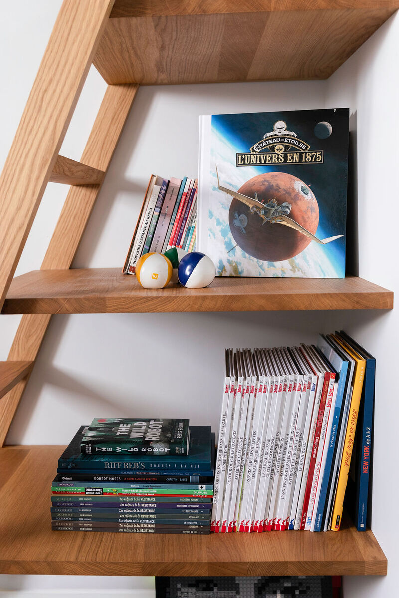 Dans l’espace enfants, une mezzanine a été créée : son échelle fait également office de bibliothèque, tandis que des tasseaux en chêne assurent la sécurité et se prolongent sous le lit pour envelopper délicatement le coin nuit.