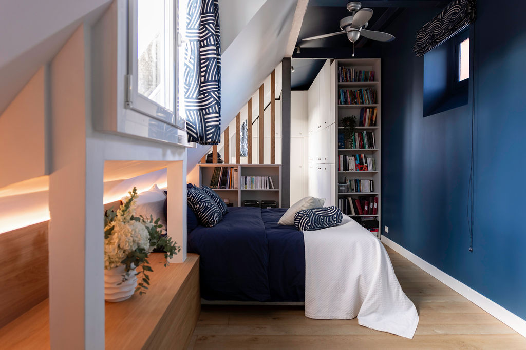 Dans la chambre parentale, une tête de lit XXL intègre des portes cintrées permettant un passage fluide, ainsi que des rangements bas pour exploiter toute la surface disponible. Un ruban LED diffuse une lumière douce et tamisée, et des tasseaux viennent séparer subtilement le dressing de l’espace nuit.