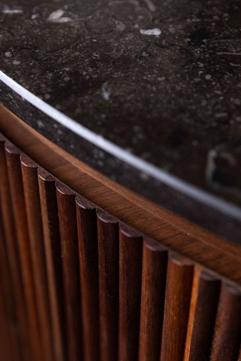 Une bibliothèque en noyer massif, associée à des tubes métalliques, apporte une touche loft industriel. Et au cœur de la pièce de vie, l’îlot de cuisine — véritable pièce maîtresse — mêle noyer américain cannelé et pierre bleue du Hainaut pour une présence à la fois chaleureuse et contemporaine.