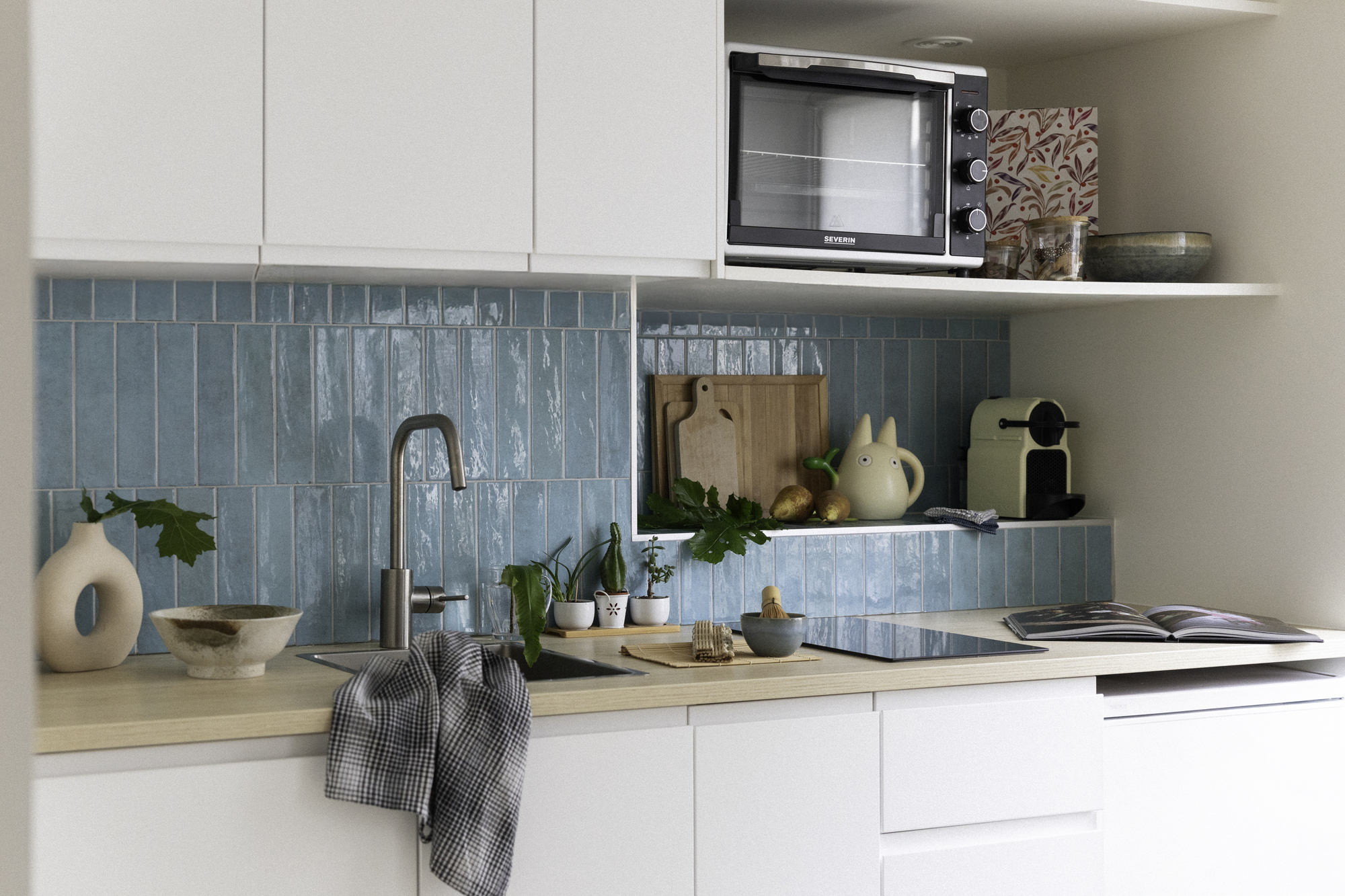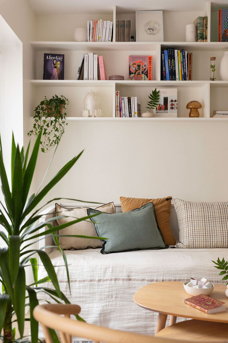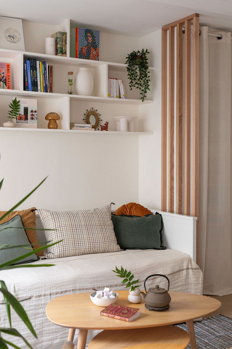 L’esprit Japandi se glisse dans les détails : bois naturel, verdure, palette colorée apaisante… Un vrai petit cocon à vivre, étudier et se poser.