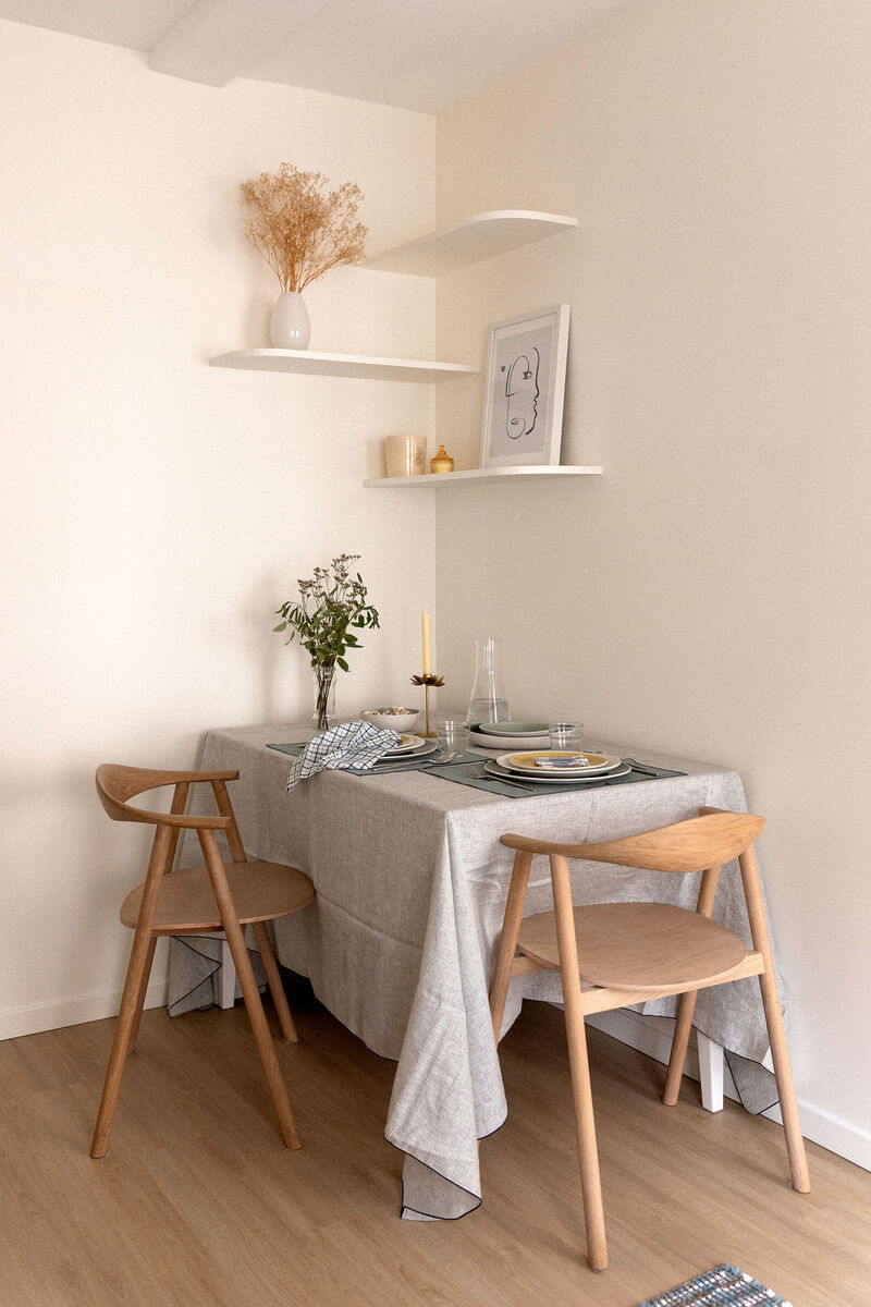 Ce studio niché près de la place Monge mise sur l’essentiel et coche toutes les cases : des rangements futés (hello le dressing caché derrière les rideaux !), des tasseaux bois pour délimiter l’entrée du séjour/chambre tout en gardant la lumière naturelle, une salle de bain mini-format mais coordonnée avec soin, et un espace repas polyvalent.