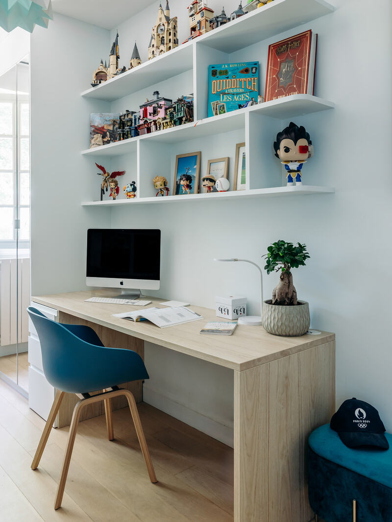 Dans les chambres d’enfants, l’atmosphère se fait douce et lumineuse. Les teintes Stone Blue et Cabbage White de Farrow & Ball s’associent à un parquet en chêne massif clair pour créer un univers joyeux, apaisant et intemporel. L’objectif était de concevoir des chambres d’enfants élégantes, capables d’évoluer avec eux sans tomber dans un décor trop marqué ou éphémère. On entre dans un monde sensible et enveloppant, pensé pour durer.